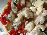 2、将白醋煮沸,加白糖,精盐,煮至溶解,滤清,凉后倒入盆里,将猪脚块浸6小时,随食随取。