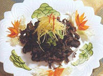 4、炒锅内留油50克,烧至八成热,下玉兰片,青辣椒、水发香菇,精盐0、5克煸炒一会,再下鳝丝,烹入绍酒合炒。接着将黄醋,紫苏叶,湿淀粉、味精、肉清汤兑成汁子,倒入炒锅,颠两下,盛入盘中,撒上胡椒粉,淋入芝麻油,香菜拼入盘边即成。