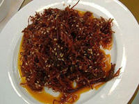 3、炒锅烧热,下菜油至七成热,放姜片炸出香味、捞出,待油温降至三成热时,将锅移置小火灶上,放入牛肉片慢慢炸透,滗去约三分之一的油,烹入绍酒拌匀,再加辣椒和花椒粉、白糖、味精、五香粉,颠翻均匀,起锅晾凉淋上芝麻油即成。