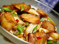 2、将白肉先下入热油中煸炒至肉出油卷起,即加入豆瓣酱、面酱炸出味后下青蒜和其它各种调料,再翻炒几下即成