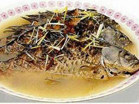 主料:活鲤鱼1条(约500-750克)。调料:料酒10克,味精2克,盐5克,葱丝、姜汁、胡椒粉、白醋、猪油、香菜各适量,高汤500克。