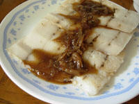 4、出锅晾冷,粿面抹上熟花生油倒扣在板上除去笼布抹上熟花生油,然后再翻扣在另一块板上切长方形块。