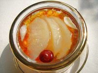 2、将冰糖加清水500克入锅,微火煮至糖化汁粘时,用纱布滤去杂质,然后将净糖汁150克,冲入燕窝的小盆里,滗去糖汁,再将剩余的净糖汁冲入燕窝,上笼屉用旺火蒸五分钟取出,撒上樱桃片即成。