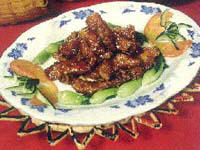 3、开温火热猪油(500克)锅,将排骨放入菱粉、蛋白糊里抓一抓,再放入油锅氽熟,然后将排骨取出,滤去油,盛在盘中。锅里的油也同时倒出。