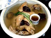 肥嫩母鸡1只,水发香菇2朵,火腿肉2片,高粱酒50克,鸡汤750克,丁香子5粒。