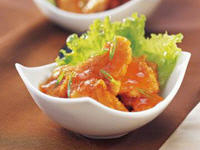 2、油七成热时,投入沾满干淀粉的肉片过炸,炸至呈金黄色捞出;姜末、蒜末热油炸香,倒入肉片、蜂蜜、醋、精盐、香油、味精、食用红色素,快速炒拌便起锅排盘即可。