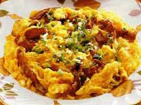 鸡蛋8个,花生油500克,葱末5克,香油2克,腌牛肉片250克,精盐3克,胡椒粉、味精各1克。