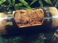 2、将鮰鱼从腹部剖开,去内脏,洗净沥干。切成5厘米长,3厘米宽、2厘米厚的长方形块,再用水清洗一闪,沥干水放入大碗。加原汁酱油、豆瓣酱、胡椒 粉、五香粉、甜面酱、花椒粉、精盐、白糖、白醋、绍酒、味精、芝麻油、辣椒油、葱、姜末拌匀,然后加入米粉、熟猪拌匀,腌5分钟,再将腌好的鱼放入竹筒,盖上筒盖,上笼蒸20分钟取出。用托盘竹上席,揭去盖即成