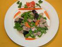 4、炒锅内留少许油置旺火上,下兔肉片急炒,撒上葱花、花椒粉,淋入香油,持锅颠几下,装盘即成。