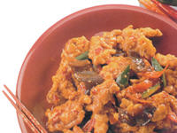 猪肉切成长约4厘米、宽4厘米、厚0.3厘米的片,加盐、料酒、鸡蛋、豆粉拌匀。水发玉兰片切成薄片,泡辣椒去籽切成菱形,姜、蒜切片,葱切成马耳朵形,用酱油、糖、醋、味精、水豆粉、鲜汤兑成芡汁。炒锅置旺火上,放油烧热(约120℃),将肉片理平入锅,煎至呈金黄色时翻面,待两面都呈金黄色后,将肉片拨至一边,下泡辣椒、姜、蒜、木耳、兰片、菜心、葱迅速炒几下,然后与肉片炒匀,烹入芡汁,迅速翻簸起锅,装盘即成。