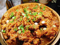 2、加豆瓣、醪糟汁、酱油、花椒粉,辣椒粉,蒜泥及米粉拌均;