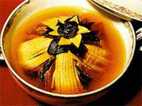 2、将笋块放入砂锅中,加入火腿骨和水,旺火烧开后转小火炖15分钟,笋熟味出时离火待用;