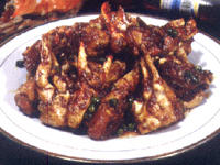 1、梭子蟹去盖治净,剁下大鳌,每只切成8块,撒上干面粉,下4成热油中煎至7成熟,加葱姜蒜同煎。