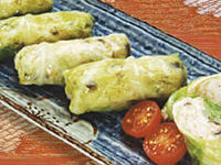 3.将菜叶沥干水分,用洁净干布沾干,平铺在案板上,再将猪肉馅放在菜叶的一端捏成长条然后将菜叶卷成卷,改刀切成寸段,码放在盘中,入笼蒸熟取出。